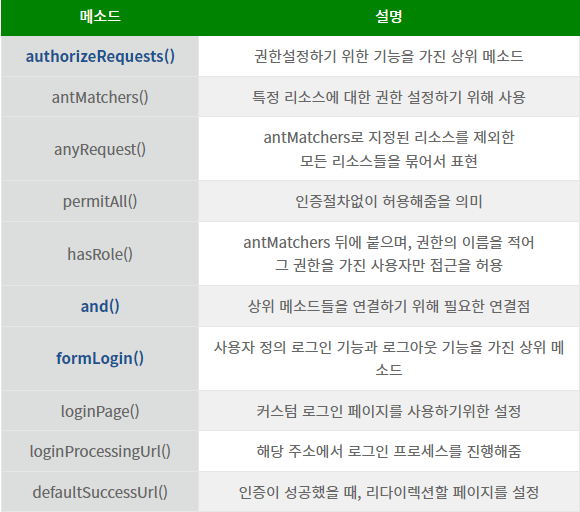 - .authorizeRequests 아래에서 작동하고, 특정 리소스에 대해서 권한을 설정하는 역할을 한다. 뒤에 authenticated가 붙은 것은 허용된 사용자의 접근만을 허용한다는 것이다.