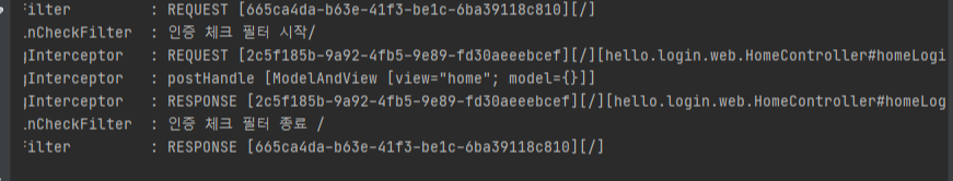 요청이 동작할 때 로그를 찍어주는 인터셉터이다. 핸들러의 인자를 보면 필터와 다르게 핸들러 동작 정보도 받을 수 있다. 필터와 다르게 호출 시점이 분리되어 있기 때문에 로그 구분을 위해서 찍는 uuid 전달을 위해서 preHandle 메서드에서 setAttribute로 로그 id를 전달하고, afterCompletion에서 getAttribute로 받는 것을 볼 수 있다.