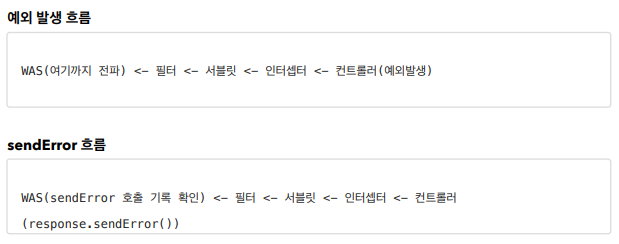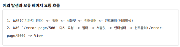 컨트롤러에서 예외가 발생했을때 서블릿 안에서 오류가 처리되지 못했을 때, 서블릿은 오류 페이지를 찾고, WAS는 해당 예외를 처리하는 오류 페이지가 존재하는지 확인한다. WAS가 이 로직을 처리하기 때문에 웹 서버는 해당 로직을 알 수 없다.
