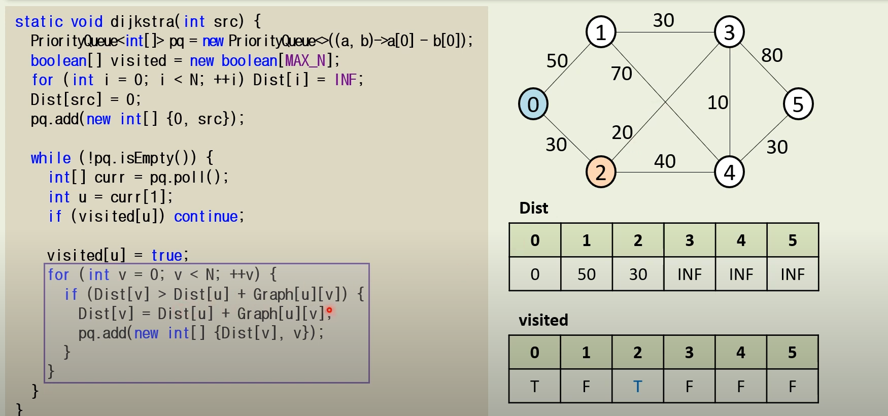if(!visited[next.dest]) { // 갱신시에만 visited 체크