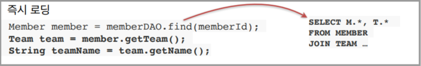 > 미리 JOIN하여 조회하도록 설정. sql를 한번만 보내서 쿼리가 네트워크를 여러번 통하지 않게 만듬 (위 예제에서는 Member를 조회하면 TEAM을 JOIN하여 조회하도록 설정)