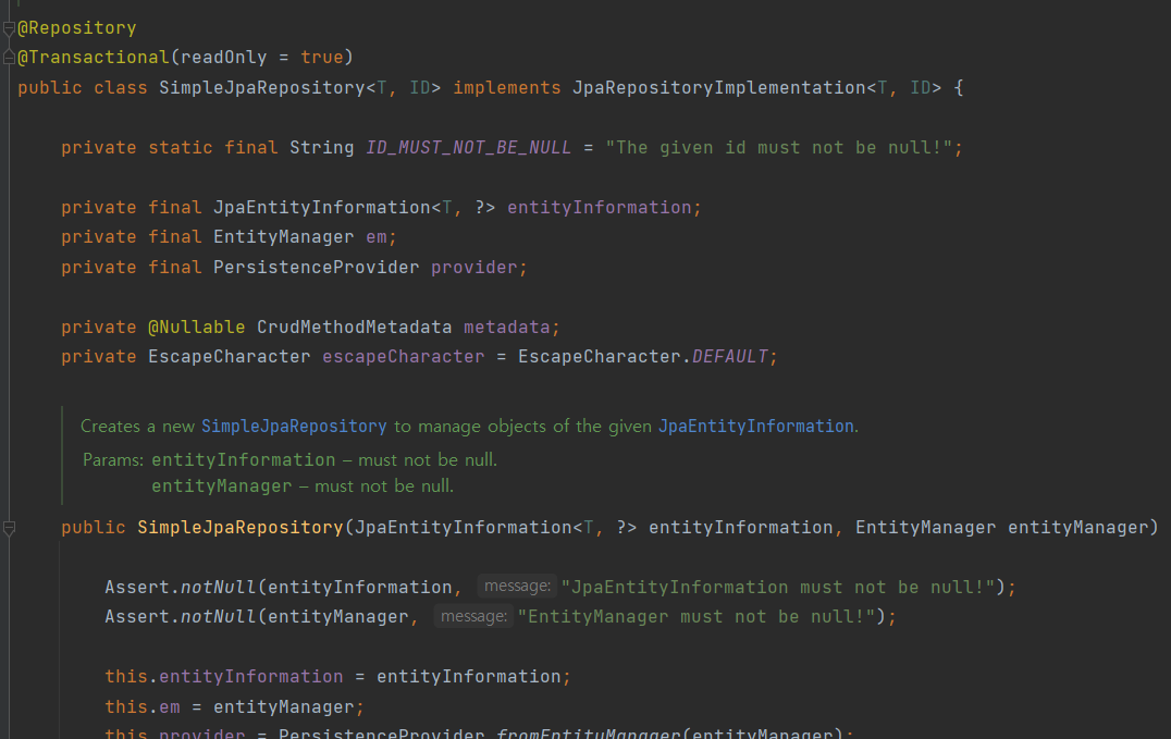 마지막으로 Spring Data JPA는 Spring에서 제공하는 모듈 중 하나로, 개발자가 JPA를 더욱 편하게 사용할 수 있도록 돕는다. (JPA가 아니라 JDBC, Redis등 다른 기술들에 대한 모듈도 당연히 존재한다) Repository 인터페이스를 사용하여 명명규칙에 맞게 추상메소드를 입력하면 Spring이 알아서 동적 프록시 기술을 이용하여 해당 메소드 이름에 적합한 jpql쿼리를 날리는 구현체(EntityManager의 구현체)를 사용하여 빈으로 등록하는데, 이러한 기능이 Spring Data JPA의 기능이다. Spring Data JPA는 JPA를 추상화시킨 것으로, 내부적으로 JPA의 EntityMager를 사용하여 기능을 구현함을 알 수 있다.