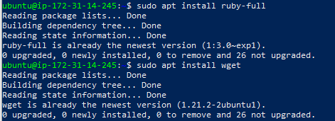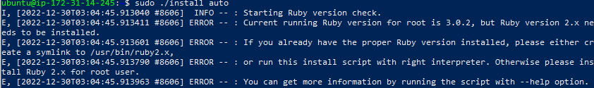 -> https://lemontia.tistory.com/1080등의 포스트를 보면 ruby를 깔면 되는것같은데 난 https://docs.aws.amazon.com/ko_kr/codedeploy/latest/userguide/codedeploy-agent-operations-install-ubuntu.html 이거보고 따라했는데 안됨. sudo apt install ruby-full 을 했을때 이미 깔려있음(