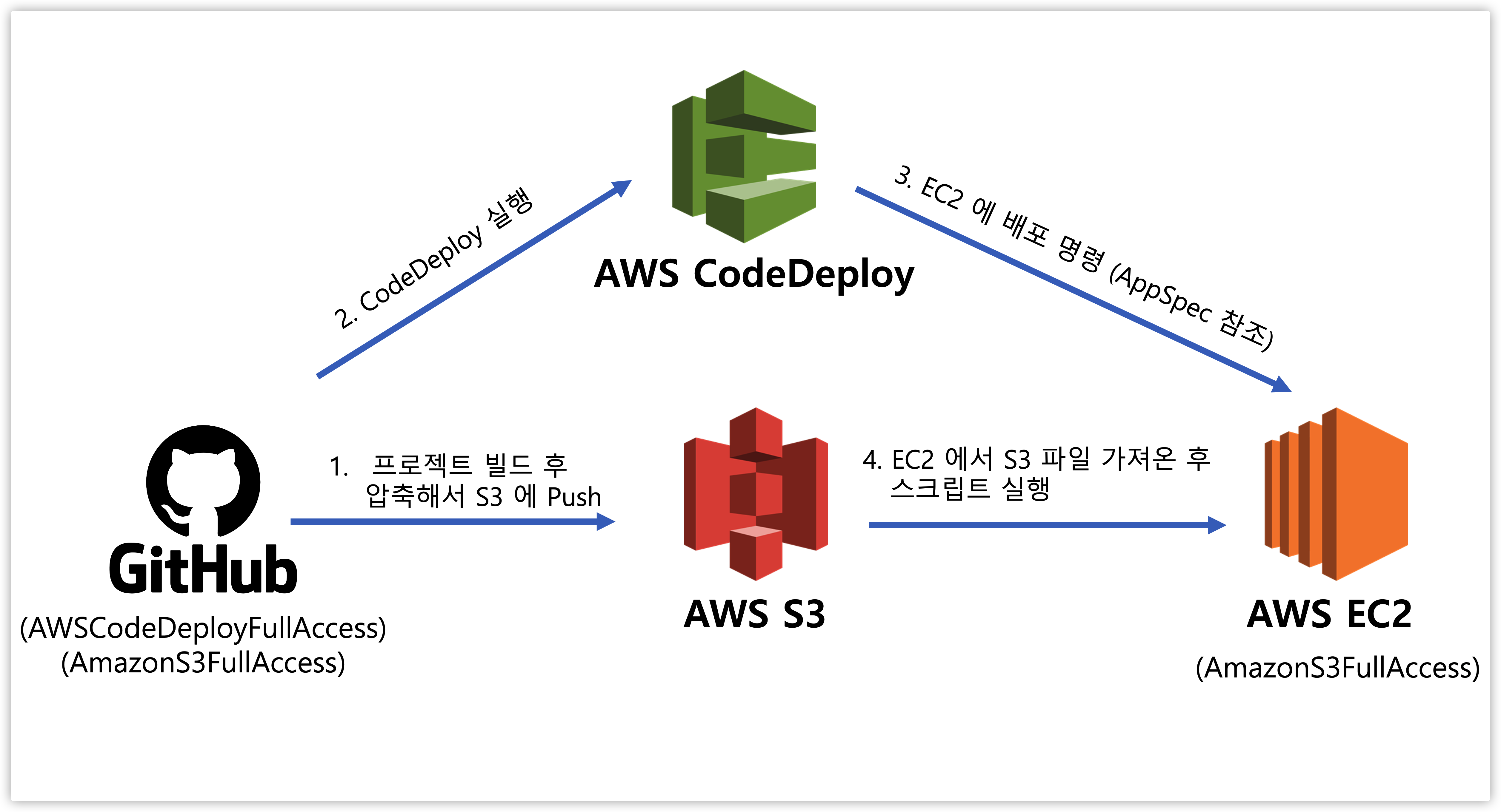 > 서버를 띄울 ec2, 배포할 결과물을 저장할 s3, 배포를 도와줄 codedeploy 이 세가지의 aws 서비스를 사용한다.