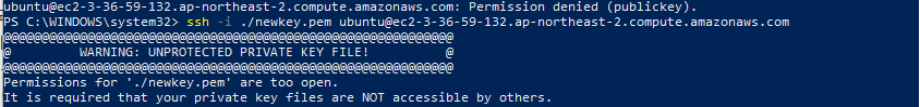 1. 권한문제: .pem파일에서 보안파일 권한 수정. (참고: https://rainbound.tistory.com/entry/%EC%9C%88%EB%8F%84%EC%9A%B0-ssh-%EC%97%B0%EA%B2%B0-%EC%97%90%EB%9F%ACpermissions-too-open%EB%93%B1)