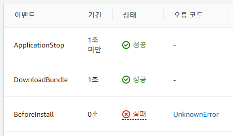 0. BeforeInstall에서 오류가 발생했으므로 appspec.yml이나 start/stop.sh의 문제는 아니라고 생각.