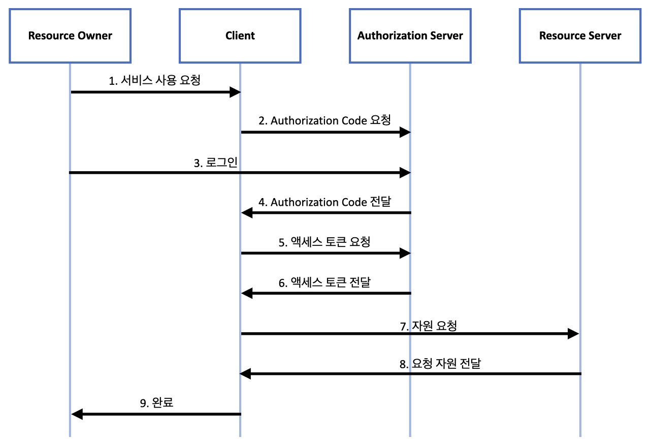 - Client: Authorization Server에 저장된 리소스를 이용하여 Resource Owner에게 서비스를 제공하려는 주체. 개발자가 다루는 서버에 해당한다. (이름이 client인 이유는 authorization server 입장에서 해석했기 때문에 그렇다)