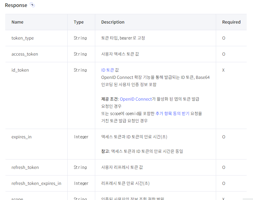 성공했다면 위와 같은 값들이 response에 담겨서 온다. 여기서 access_token이 resource서버로 자원을 요청할 수 있는 키이고, refresh_token이 토큰 재발급을 요청할 수 있는 토큰이다.