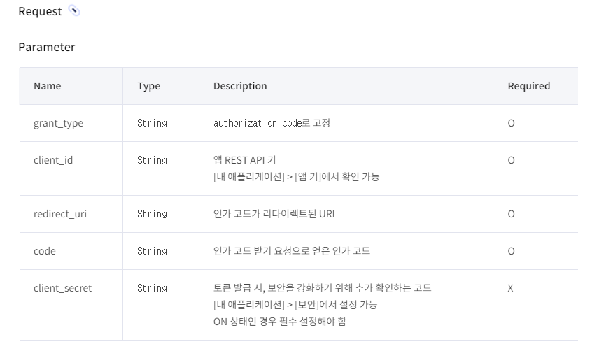 : 카카오 개발자 페이지에 나와있는대로 필요한 정보를 담아서 POST요청으로 보내주면 된다. 여기서 redirect_uri는 developers사이트에서 카카오 로그인 탭에 설정해둔 Redirect URI를 그대로 입력해주면 된다.