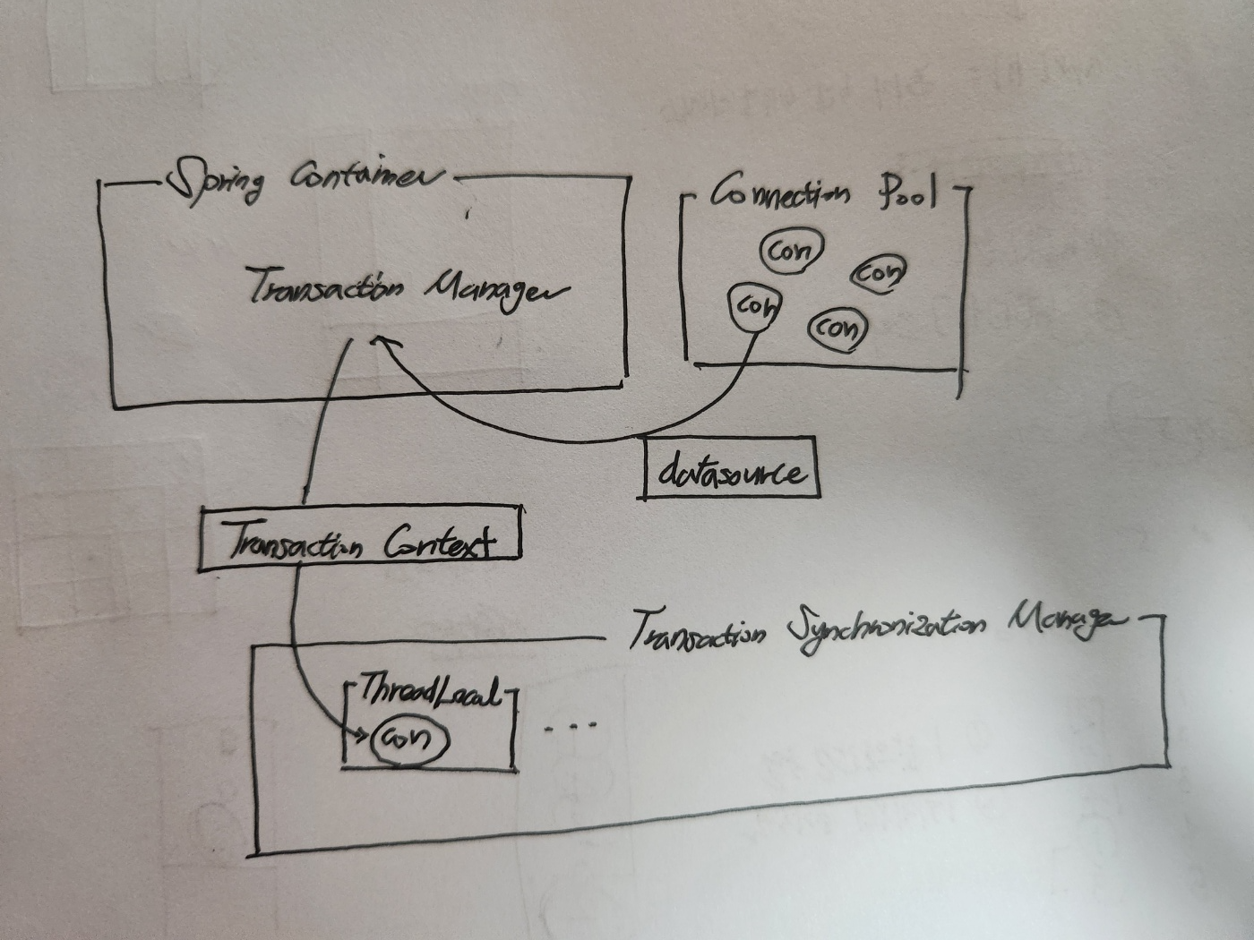 2. 트랜잭션 매니저는 트랜잭션 컨텍스트를 통해 생성된 커넥션을 트랜잭션 동기화 매니저에 보관한다. 트랜잭션 컨텍스트는 트랜잭션 매니저와 트랜잭션 동기화 매니저 사이에서 트랜잭션의 작업을 관리한다.