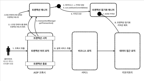 이렇게 트랜잭션 매니저가 커넥션 획득과 반납을 담당한다면, 트랜잭션의 시작과 종료을 관리하는 객체는 '트랜잭션 프록시'이다.