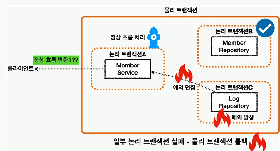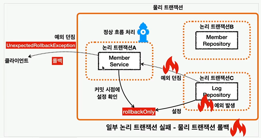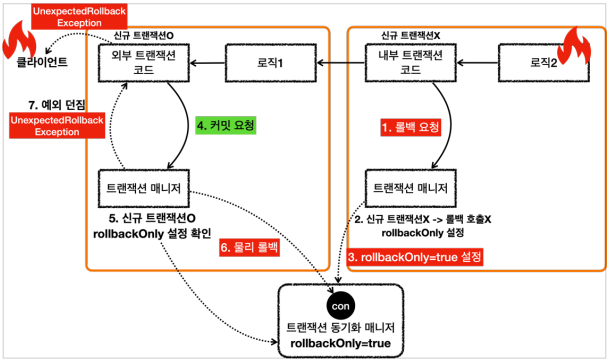 물리 트랜잭션 내에 존재하는 여러개의 트랜잭션들은 논리 트랜잭션이라고 하며, 물리 트랜잭션이 커밋되기 위해서는 내부의 모든 논리 트랜잭션이 커밋되어야 한다. 하나의 논리 트랜잭션이라도 롤백되면 물리 트랜잭션도 롤백된다. 내부 트랜잭션이 커밋되고 외부 트랜잭션이 롤백되면 문제가 발생하지 않지만, 내부 트랜잭션이 롤백되면 트랜잭션 동기화 매니저에 rollbackOnly = true옵션이 설정되는데 이 상태에서 외부 트랜잭션 커밋을 시도하면 UnexpectedRollbackException이 발생하며 외부 트랜잭션도 롤백되었음을 알려준다.