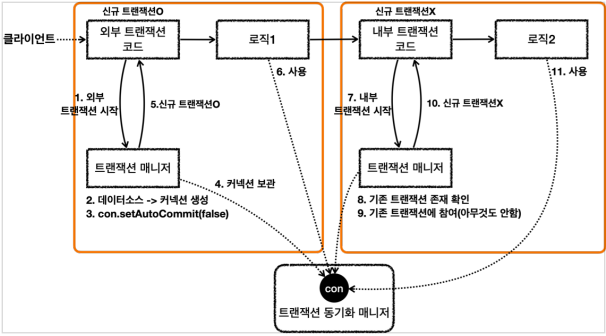 결국 처음 시작한 논리 트랜잭션(=외부 트랜잭션)과 이후 시작한 논리 트랜잭션(내부 트랜잭션)은 모두 물리적으로 하나의 트랜잭션으로 묶여있기에, 두 트랜잭션 진행 중 커넥션을 요청할 경우 트랜잭션 동기화 매니저에서 동일한 커넥션을 획득하게 된다. 한마디로 외부 트랜잭션의 시작과 종료만이 트랜잭션의 물리적인 변화를 초래하며, 내부 트랜잭션들의 시작과 종료는 별도의 물리적 동작으로 연결되지 않는다.