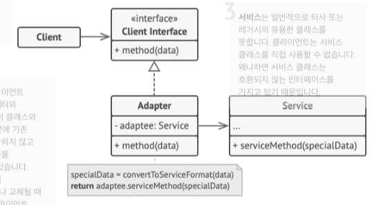 자바에서 어댑터 패턴은 인터페이스 구현과 객체 합성을 이용하면 된다. 위 다이어그램에서 Adapter 클래스의 목표는 공통 프로토콜인 Client Interface를 통해서 Service클래스의 메서드를 호출하는 것이다. 따라서 중간의 Adapter 클래스는 Service클래스를 참조하고 있으며 동시에 Client Interface를 구현하고 있다.