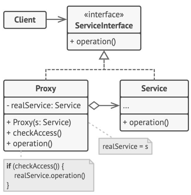 따라서 클라이언트는 인터페이스에 의존하여 자신이 프록시에 의존하고 있는지, 서비스 로직에 의존하고 있는지를 모르게 하고, 서비스 코드와 프록시를 위한 코드는 모두 동일한 인터페이스에 의존하여 핵심 로직을 구현하도록 한다. 또한 프록시는 실제 객체(위 그림에서 Service)에 의존한다. 일반적으로 프록시 클래스가 로직 클래스를 감싸서 로직을 추가하는 형태로 구현한다.