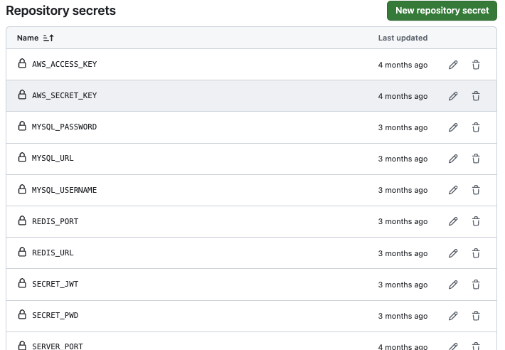 인텔리제이에서 configuration property값들을 name-value형태로 저장해둘 수 있다. 저장해둔 값들은 yml에서 위와 같이 활용할 수 있다. 비슷하게 깃헙 원격 레포지토리에서는 Repository Secrets라는 이름으로, 그리고 ec2같은 원격 서버에서는 환경변수로 값들을 key-value형태로 관리할 수 있기 때문에 해당 방법으로 CI-CD 파이프라인까지 구축할 수 있다.