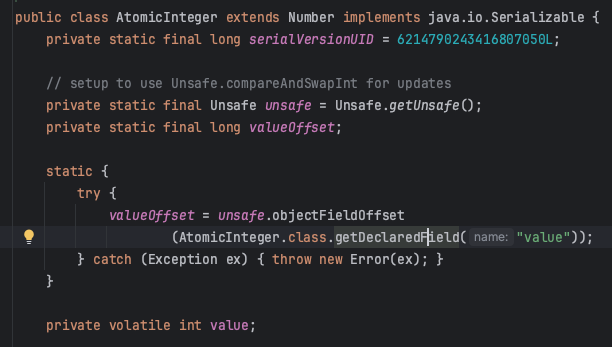 특이한 점은 AtomicInteger 내에서 사용하는 value값이 volatile int형으로 선언되어 있다는 점이다. 아래에서 설명하겠지만 volatile은 무조건 캐시가 아닌 메인 메모리를 참조하여 값을 가지고 오는데, 따라서 멀티쓰레드 환경에서 다중 쓰레드 접근이 이루어질 때에도 변수의 가시성과 원자성을 유지할 수 있다.