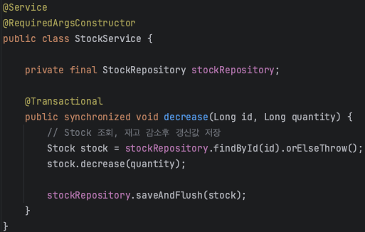 @Transactional 어노테이션을 제거하여 메소드 단독으로 실행되도록 하거나, 메소드를 호출하는 쪽에 synchronized 키워드를 설정해준다면 정상적으로 동작함을 확인할 수 있다.