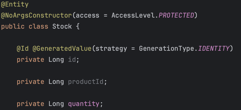 동시성 문제는 지역변수와 같이 쓰레드별로 할당되는 공간에서는 발생하지 않으며, 싱글톤과 같이 동일한 인스턴스의 필드에 접근하거나, static과 같은 공용 필드를 변경할 때 발생한다. 위와 같이 간단한 엔티티와 서비스 클래스를 생성해준 후, 재고를 감소시키는 decrease라는 로직이 동시성 이슈 위에서 제대로 동작하는지를 체크해보도록 하자.