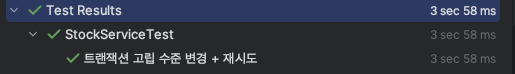 따라서 위와 같이 트랜잭션 실행 중 예외 발생시 재시도하는 로직을 추가하고, 테스트코드를 돌렸더니 성공하는 것을 확인할 수 있었다.