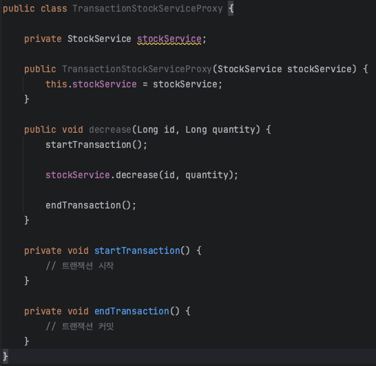예전에 정리한적 있듯이, 스레드간 blocking을 이용하여 동기화 블락 전체에 락을 걸어주어 해결할 수 있다. 다만 여기서 유의해야 할 점은, @Transactional을 사용할 때 아래 코드와 같이 스프링 트랜잭션은 프록시 방식으로 동작하기 때문에 기존의 서비스 클래스를 필드로 주입받는 가짜 객체를 사용하여 트랜잭션을 관리하게 된다.