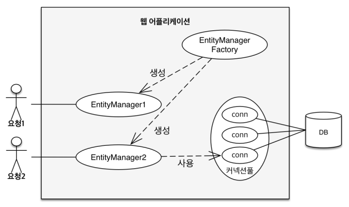 어플리케이션의 개발시 하나의 EntityManagerFactory를 통해서 고객의 요청(트랜잭션)이 올때마다 EntityManager가 생성되고, 각 커넥션을 통해 DB와 상호작용이 이루어진다. 이때 EntityManager마다 1대1로 영속성 컨텍스트가 생성된다.