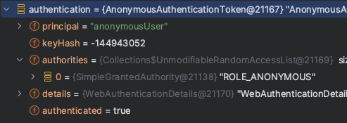 내가 별도로 설정을 변경한 부분은 없기 때문에, 스프링 시큐리티가 익명 사용자라도 ROLE_ANONYMOUS라는 authority를 가지는 하나의 인증된 사용자로 보는 것일 것이라는 추측을 할 수 있었다.