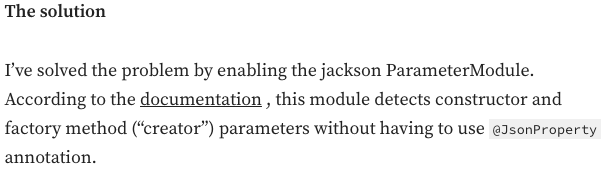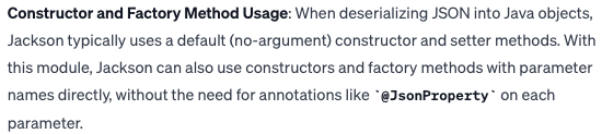 - 아래 문서에서, jackson-modules-java8의 parameter-names라는 모듈에서 기본 생성자가 없이도 다른 생성자로 대체하여 역직렬화를 수행할 수 있게 해줌을 알 수 있었다.