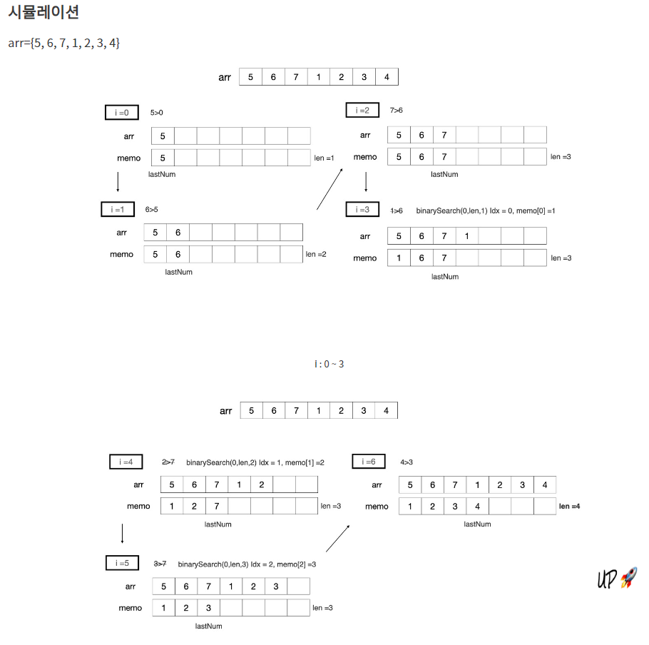 그래서 위와 같이 binary search를 사용하면 O(N^2)인 LIS의 시간복잡도를 O(NlogN)으로 줄일 수 있다. 간단하게 요약하면, arr값을 하나하나 읽어가며 dp배열(위 그림에서는 memo)의 어느 위치에 들어가야 할지를 정하는 것이다.