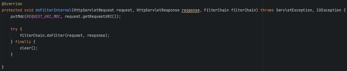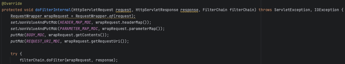 이를 위해서 Filter에서 HttpServletRequest를 인터셉트하여 정보를 Mdc에 저장할 계획이었다.