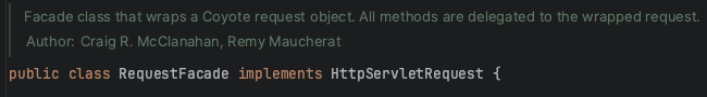 이 녀석이다. 주석에는 'wraps a Coyote request object' - coyote 패키지의 Request 객체를 갖는 래퍼 클래스라고 되어 있는데, 정확히 말하면 catalina.connector 클래스의 Request 객체를 갖고, catalina.connector 클래스의 Request 클래스 내의 request 객체가 coyote 패키지의 Request 객체를 갖는 이중 래핑이 되어있다.