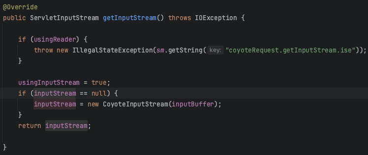 하지만 디버깅을 통해 예외가 터지는 위치를 살펴보니 Filter를 통과한 이후, Controller로 들어오기 이전이었고, 이제서야 필터에서 모종의 이유로 인해서 처리가 제대로 되지 않고 있음을 눈치챘다. 그리고 디버깅 툴을 통해서 오버라이딩한 getInputStream이 전혀 호출되지 않고 있음을 알 수 있었다.