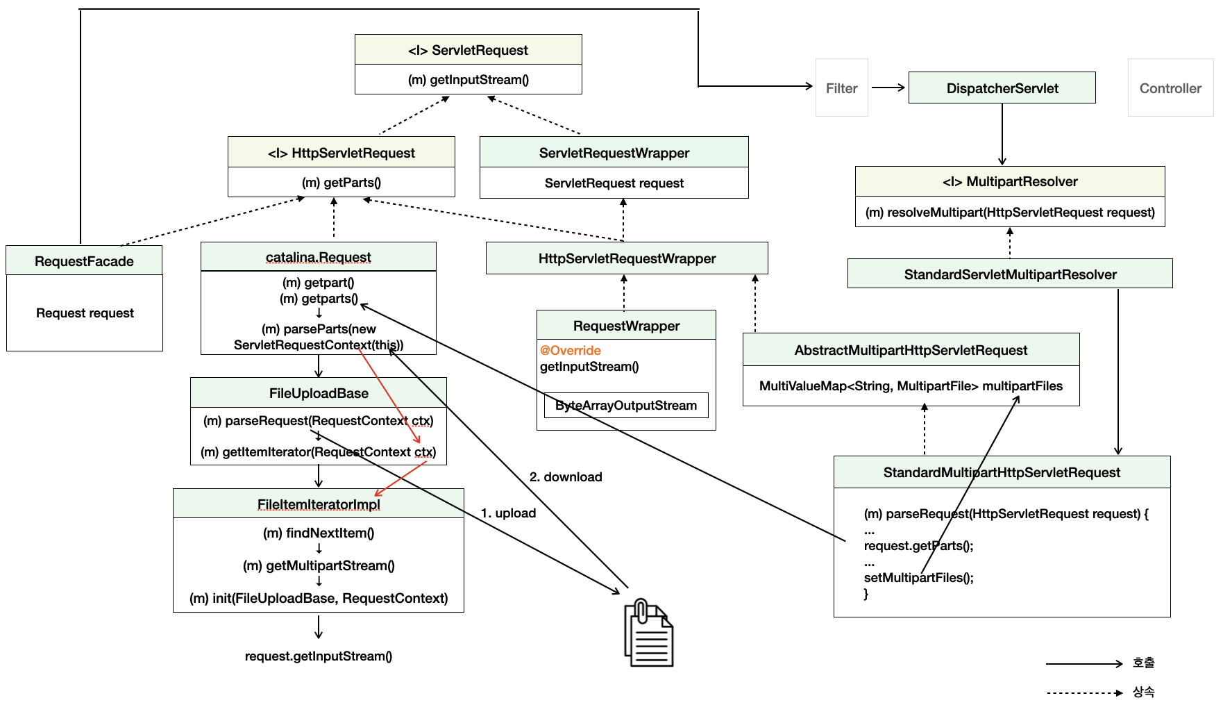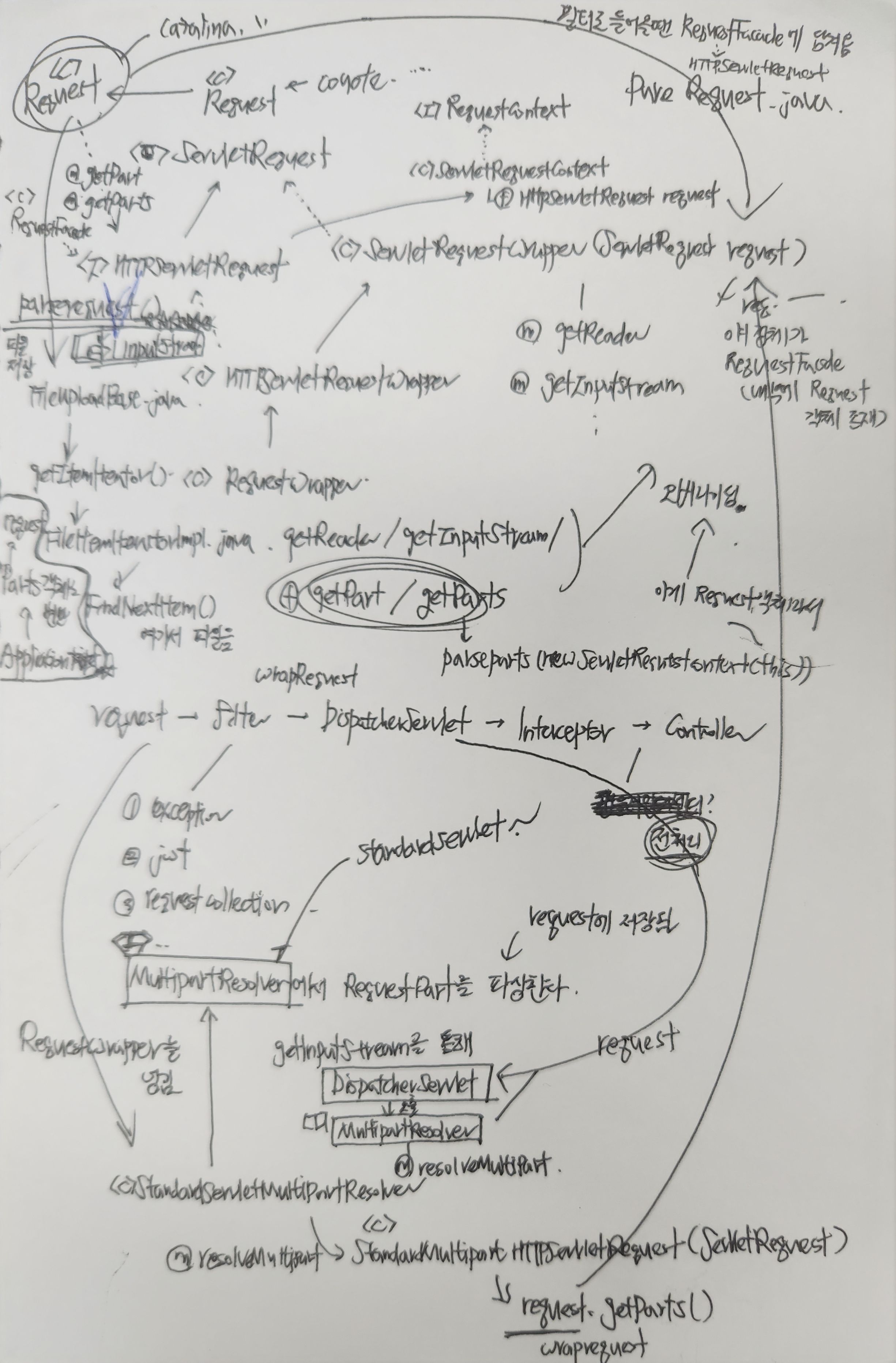 1. DispatcherServlet이 Multipart 데이터를 받을 때, MultipartResolver를 호출하고, 그 구현체를 거쳐 request에 있는 getParts() 메서드를 호출하게 된다.