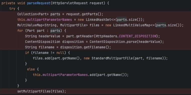 흐름을 따라가다보면 StandeardMultipartHttpServletRequest 클래스의 parseRequest 함수를 호출하게 되고, 여기서는 요청 객체의 'getParts' 메서드를 호출한다.