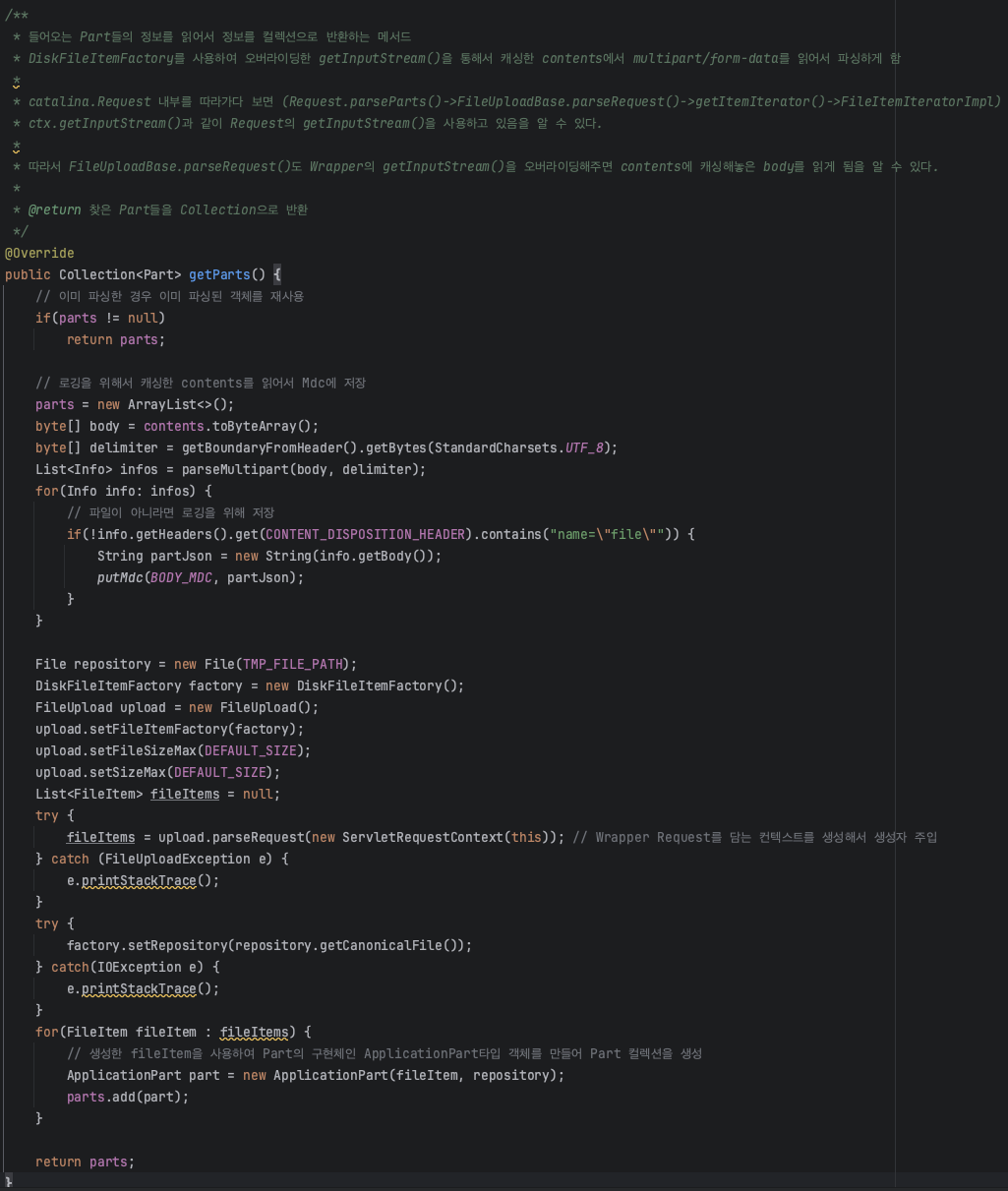 파일을 임시로 저장하고, 결과물인 FileItem 컬렉션을 통해 ApplicationPart의 컬렉션을 생성하여 반환하도록 만들어 주었다. FileUpload의 parseRequest() 메서드에서는 RequestWrapper를 감싼 ServletRequestContext를 인자로 넘겨주고 있으므로, inputStream을 호출하더라도 Request객체의 그것이 아니라 RequestWrapper에서 오버라이딩해준 getInputStream()이 호출될 것이다.