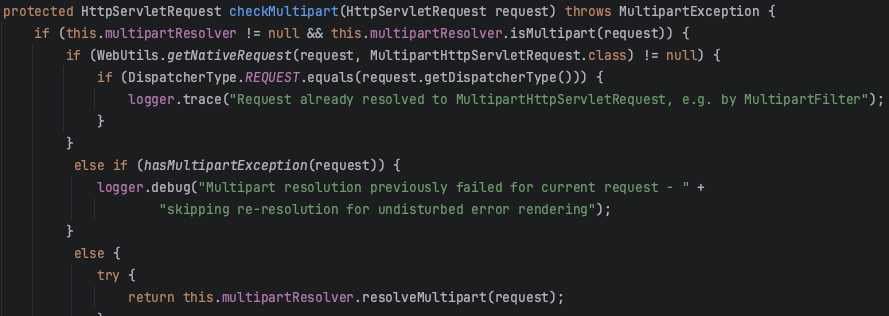 나는 위 방법으로 모든 문제가 해결되었을 것이라고 생각했다. 서블릿 내부에서도 getInputStream() 메서드를 사용해서 request body를 읽을 것이라고 확신했고, 얼마 전에 순수 자바로만 WAS를 구현했을때 내 코드와 비슷하게 스프링에서도 getInputStream으로 body를 쭉 읽은 다음 delimiter(Content-Type 헤더의 boundary 정보)로 split하여 문자열 or byte 파싱했을 것이라고 예측했기 때문이었다.