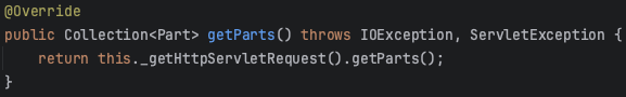 따라서 상위 클래스인 HttpServletRequestWrapper의 getParts()를 호출하는데, 여기서는 더 상위 클래스인 ServletRequestWrapper가 갖는 request 필드의 getParts() 함수를 호출한다.