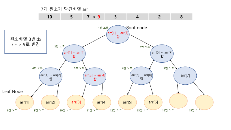 값을 업데이트한다는 것은 리프 노드를 업데이트한다는 것이고, 이는 즉 값을 바꿀 리프 노드의 부모 노드들의 값을 모두 바꾸어주면 된다.