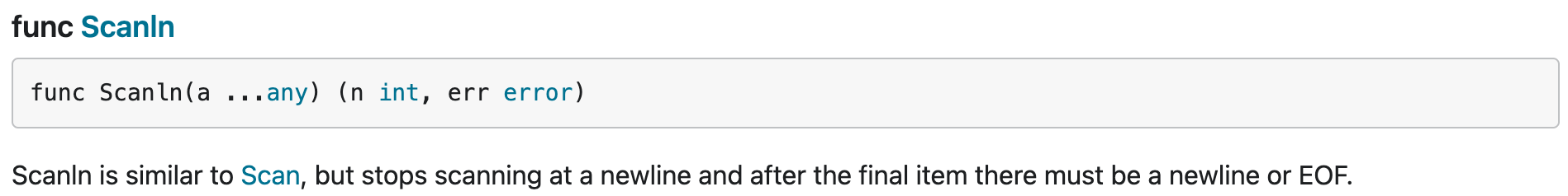 Go에서 입출력 처리를 위해서 많이 사용되는 fmt패키지를 살펴보면, 반환값으로 int형과 error형 하나씩이 존재한다. int형은 입력한 문자열의 개수, 두 번째는 에러 값을 의미한다.