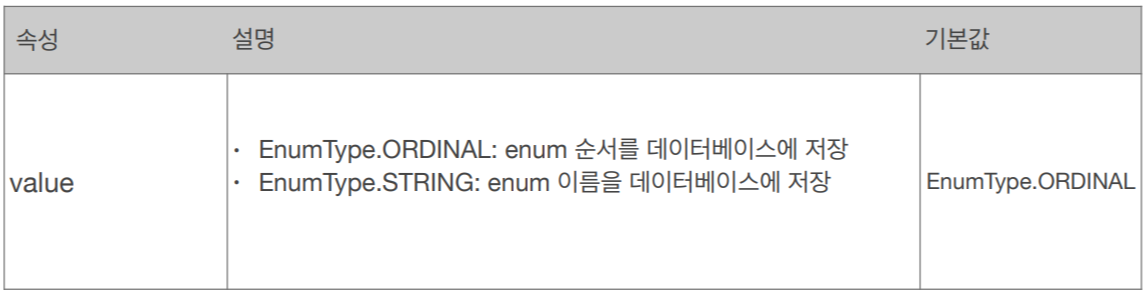 위 속성의 기본값은 ORDINAL인데 무조건 STRING으로 사용하도록 하자. ORDINAL으로 사용하면 integer로 변환되어 enum에서 지정한 순서가 저장된다. 그런데 enum타입의 순서가 DB연동중에 바뀌면 큰 문제가 발생할 수 있으므로 반드시 STRING으로만 사용하자.