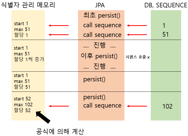 select USER_SEQ.nextval from dual 두 번 호출. 1과 51이 각각 리턴되는데, 1을 JPA가 메모리에서 관리할 시작값, 51을 끝(MAX)값 으로 지정합니다. 엔티티에 51의 식별자가 할당되는 때까지는 DB에 시퀀스를 호출하지 않고 JPA가 직접 가상의 시퀀그 값을 할당할 것입니다.