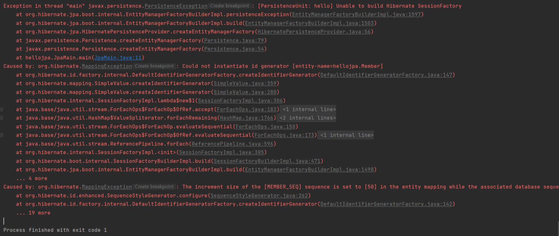 다음의 경우 식별자 관련 예외가 발생하므로 시퀀스 증가값이 1인 경우 무조건 allocationSize를 1로 할당하여 사용하도록 합니다.