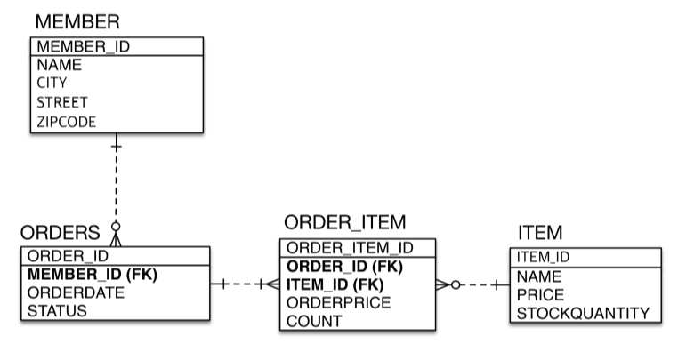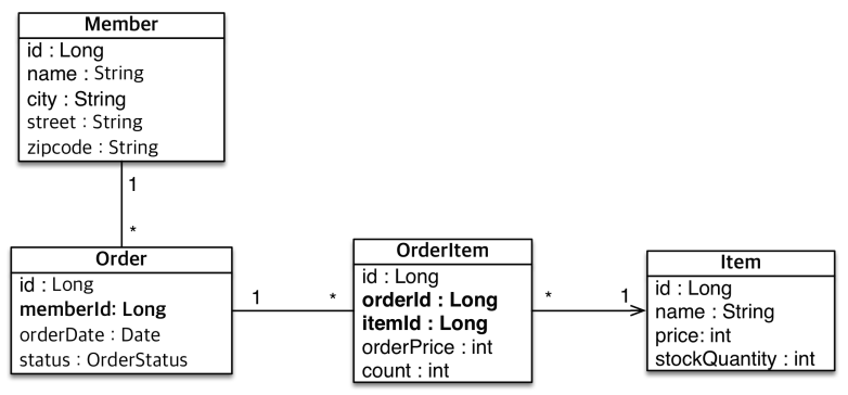테이블의 구조를 설계했으면 JPA 구성을 위해 엔티티를 설계하고 매핑해보자. 한개의 Member객체는 여러개의 Order를 만들 수 있고(일대다 매핑), Order와 Item사이에는 다대다 매핑이 가능하도록 설계했다(하나의 order에 여러개의 item이 들어갈수도, 한 item이 여러 order에 들어갈수도 있으므로).