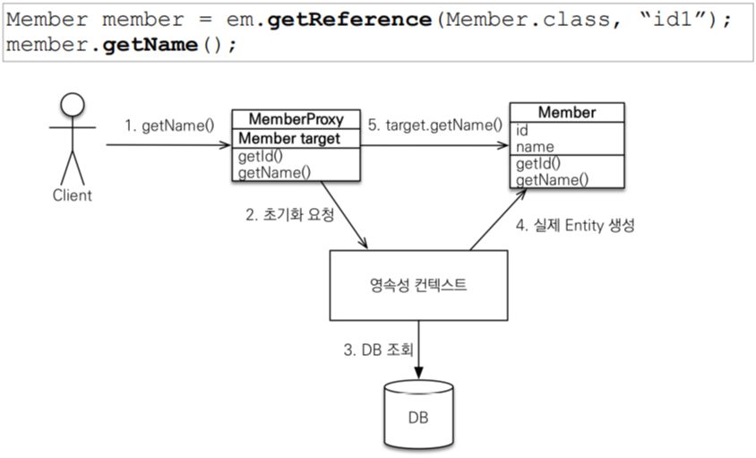 getReference()함수를 사용하면 실제 엔티티를 상속받는 가짜 엔티티 객체가 hibernate에 의해 만들어지고, 그 가짜 객체, 즉 프록시 객체를 조회하게 된다. 이 프록시 객체는 실제 객체의 참조를 보관하고 있어서, 프록시 객체의 메소드를 호출하면 프록시 객체가 실제 객체의 메소드를 호출한다.