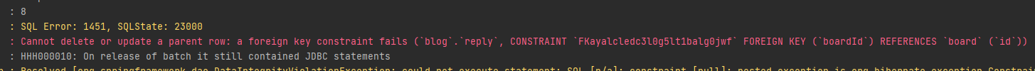 이렇게 자식 엔티티와 연결되어있을 때 부모 엔티티를 삭제하려고 할 경우 cascade 설정을 해주지 않으면 위와 같이 오류가 뜨는데, cascade = CascadeType.REMOVE로 속성을 지정해주면 해결된다. 이 옵션은 부모 엔티티를 삭제할 때 연관된 자식 엔티티도 삭제하도록 하는 옵션이다.
