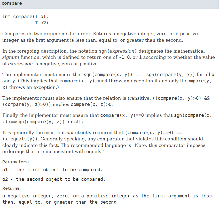 그렇다면 여기서 리턴된 int형 값은 정렬 컬렉션들에서는 어떻게 이용할까? Java에서는 선행 원소와 후행 원소의 차가 음수가 나오면 교환이 이루어지지 않고, 양수가 나오면 교환하는 식으로 compare, compareTo메소드를 이용하여 오름차순(순서대로 커지도록)으로 정렬한다.