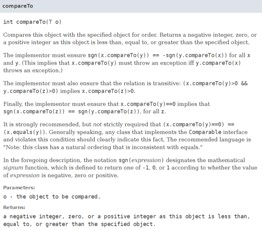 먼저 Comparable의 자바 공식 API사이트에 들어가보면, compareTo 메소드를 오버라이드해주어야 한다고 나와있다. 위에서 객체의 비교를 위해 비교 메소드를 오버라이드해주어야 한다고 했다. Comparable의 그 비교 메소드가 compareTo인 것이다.